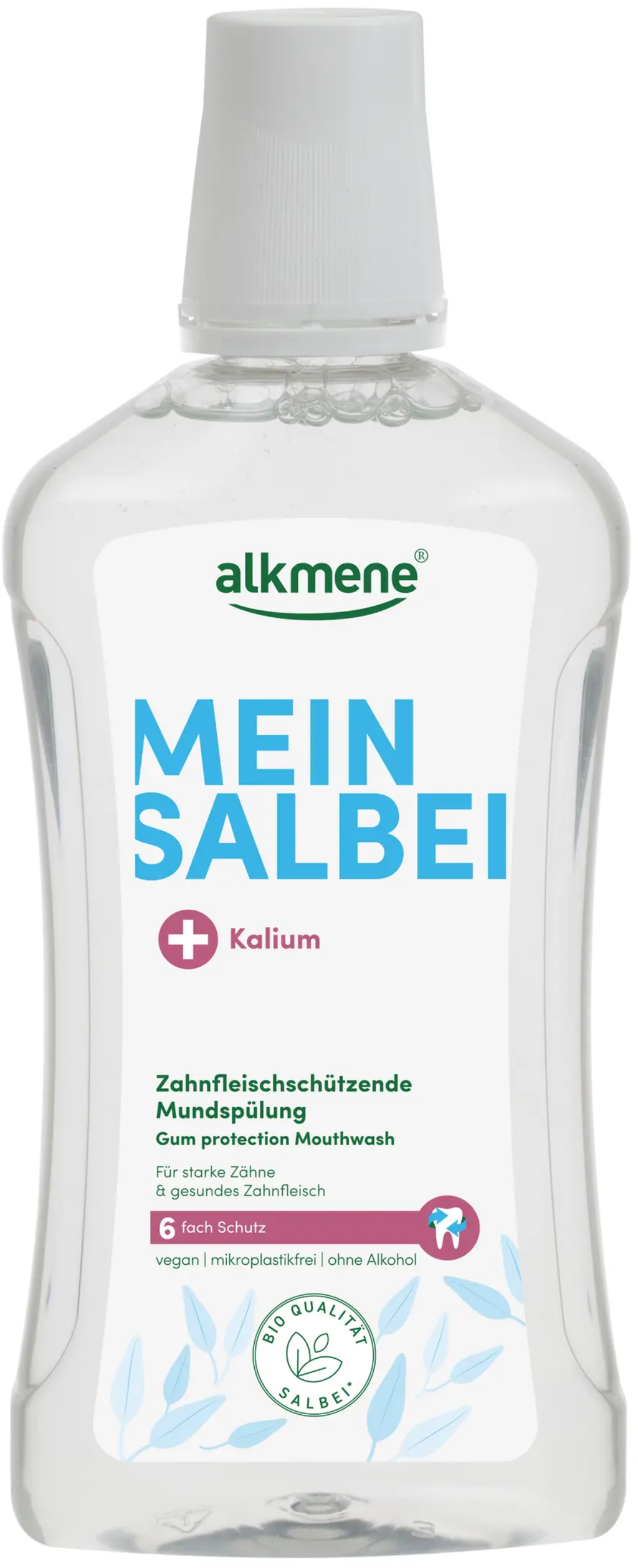 Die Mein Salbei Mundspülung von alkmene schützt Zähne und Zahnfleisch mit der wertvollen Kombination aus Salbei, Fluorid und Kalium. Die Mundspülung ist vegan und frei von Mikroplastik und Alkohol.