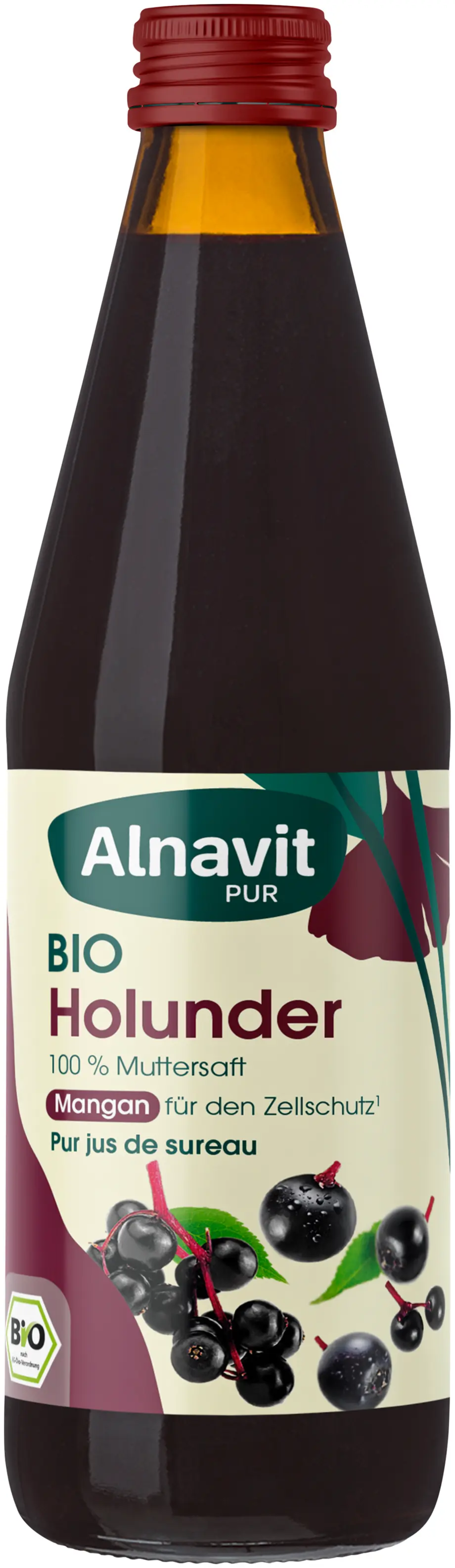 Holunder pur – intensiv, fruchtig und mit natürlichem Mangan. Der Saft ist frei von Zusätzen und ideal für den puren Genuss oder als wärmendes Getränk an kalten Tagen. Heiß oder kalt genießen, pur oder in Getränken und Desserts.