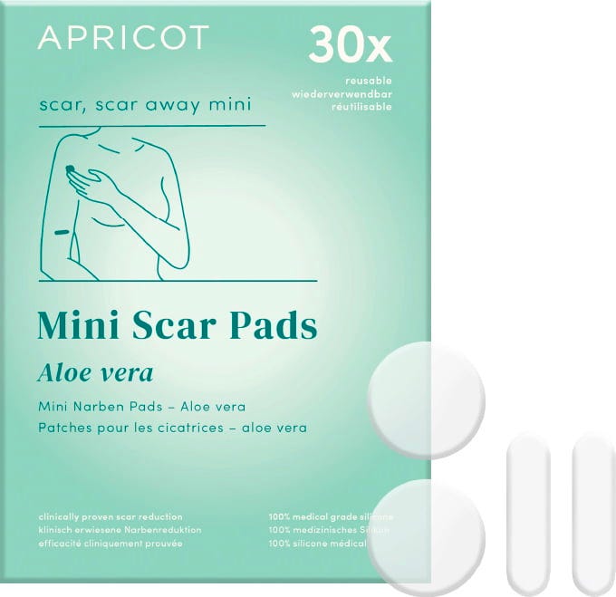 Die Aloe Vera Narben‑Pads von APRICOT eignen sich zur Anwendung auf alten und neuen Narben. Dank Aloe Vera wird die Narbe intensiv gepflegt. Die Pads bestehen aus medizinischem Silikon und sind bis zu 30x wiederverwendbar. Sie können auch an empfindlicher Haut oder als After-Sun-Pflege verwendet werden.