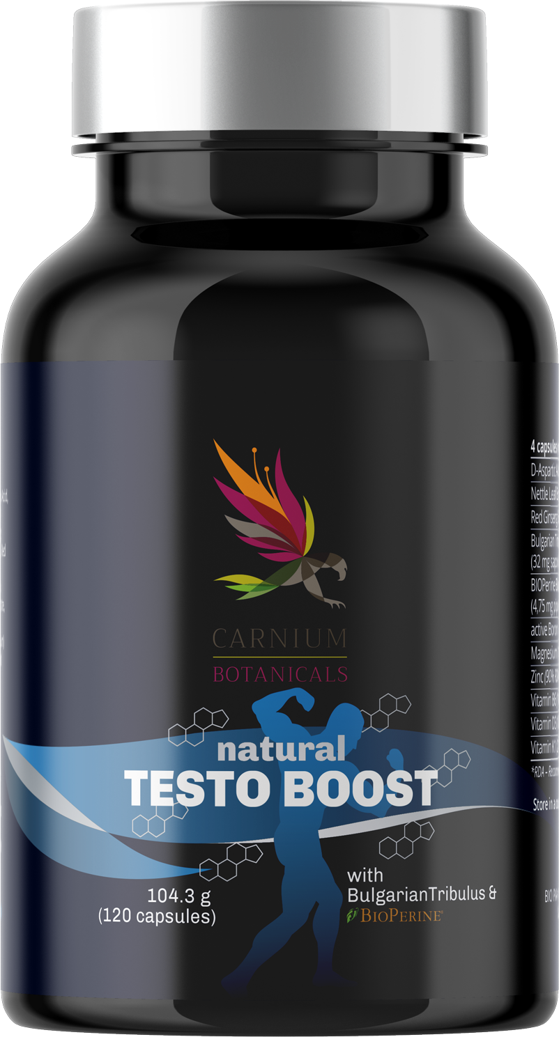 Natural Testo Boost von Carnium Botanicals sind vitamin- und mineralstoffreiche Kapseln, die den Hormonhaushalt von Männern optimal unterstützen können. Sie enthalten unter anderem D-Asparaginsäure, Brennnessel, roten Ginseng, Zink, Magnesium, Vitamin D3 und B6.