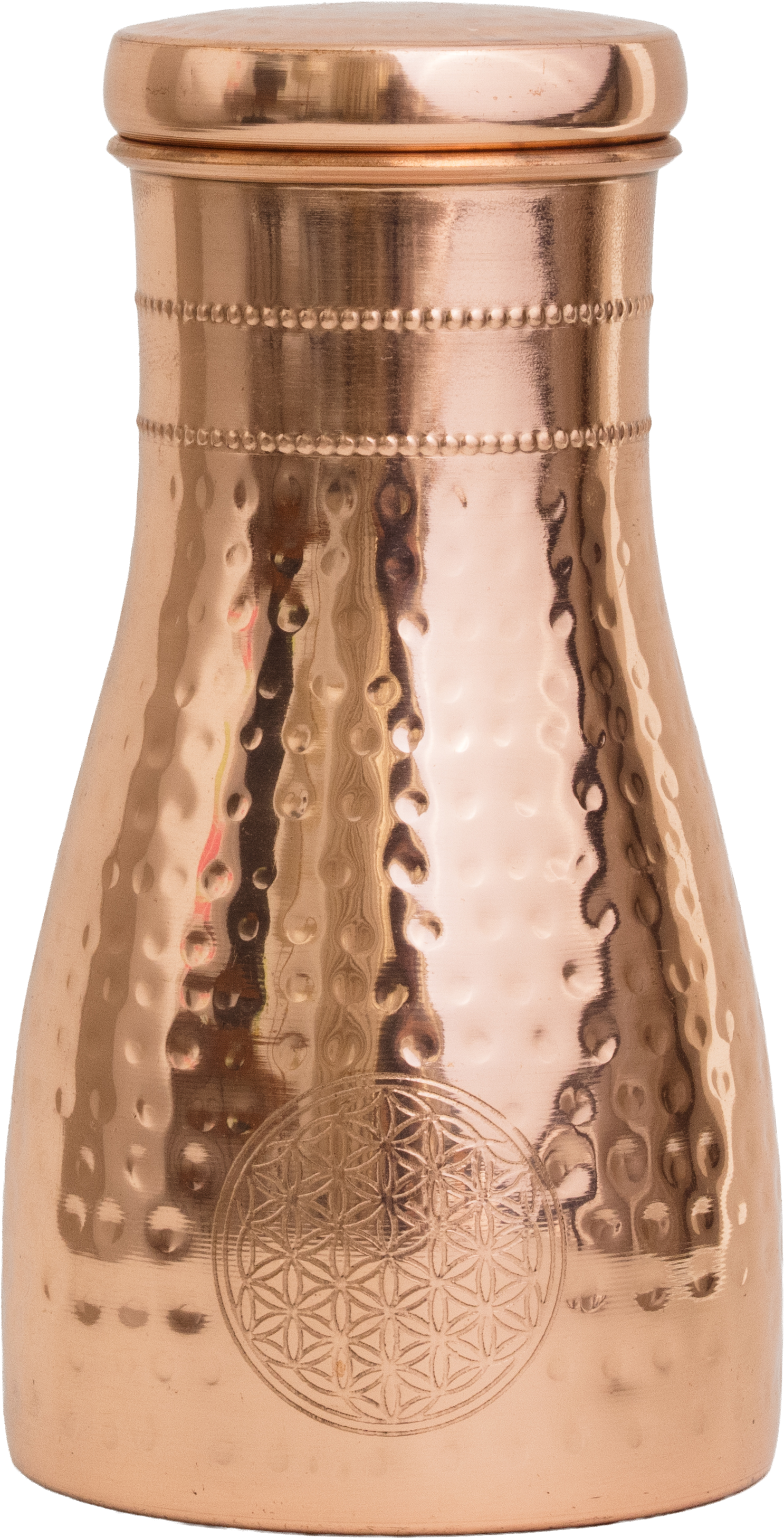 Die gehämmerte Kupferkanne mit dem Motiv der Blume des Lebens wurde gemacht, um jedes Glas Wasser in eine achtsame Handlung zu verwandeln. Der lose sitzende Deckel ist praktisch, um rasch und problemlos Wasser ausgießen zu können. Das alles macht sie perfekt für einen ayurvedischen Lifestyle.