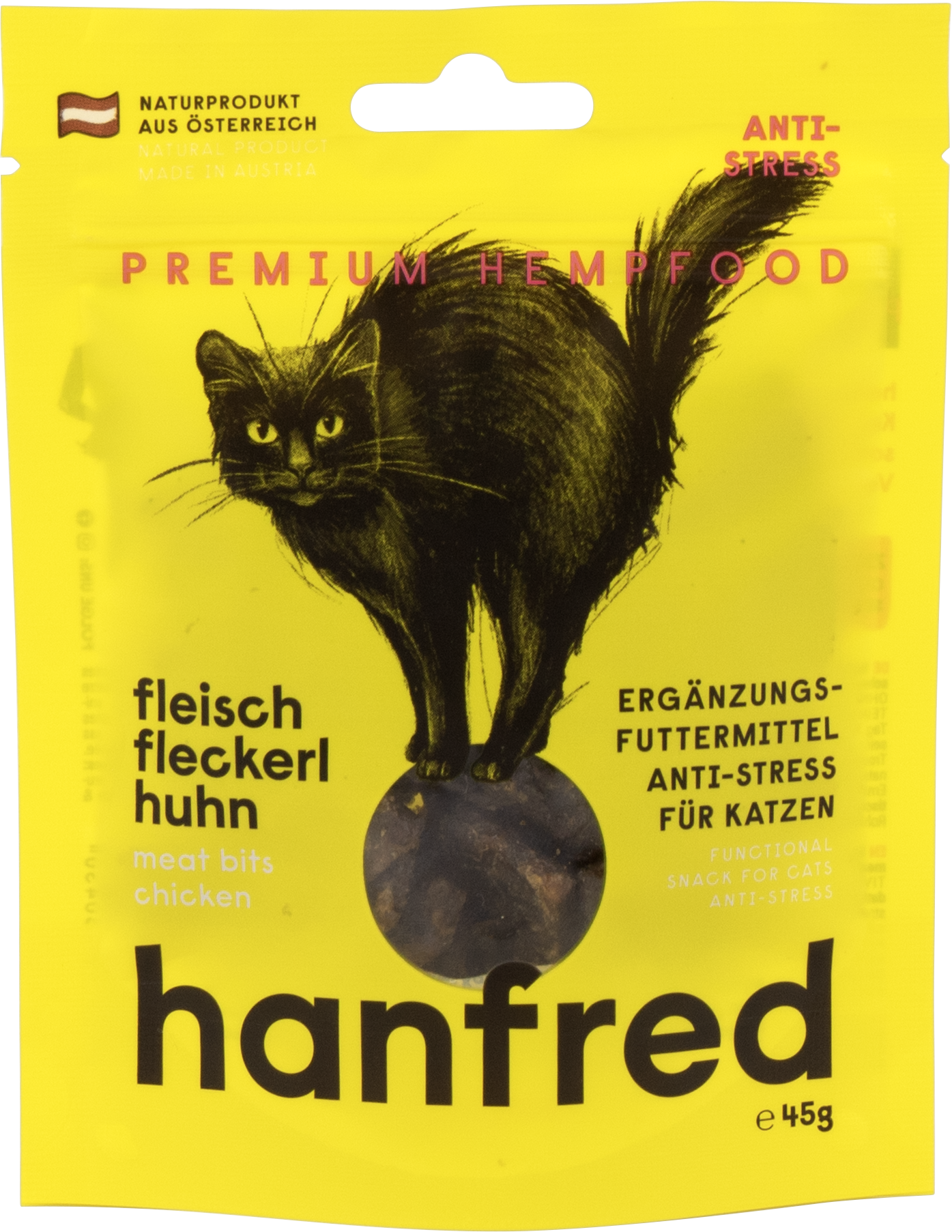 Wenn deine Katze sensibel auf Veränderungen oder stressige Situationen reagiert, kann dieser Snack eine gute Wahl sein. Die Hanfred Fleisch-Fleckerl bestehen aus 95 % Fleisch und 5 % Hanfpulver – ganz ohne Getreide und künstliche Zusätze.