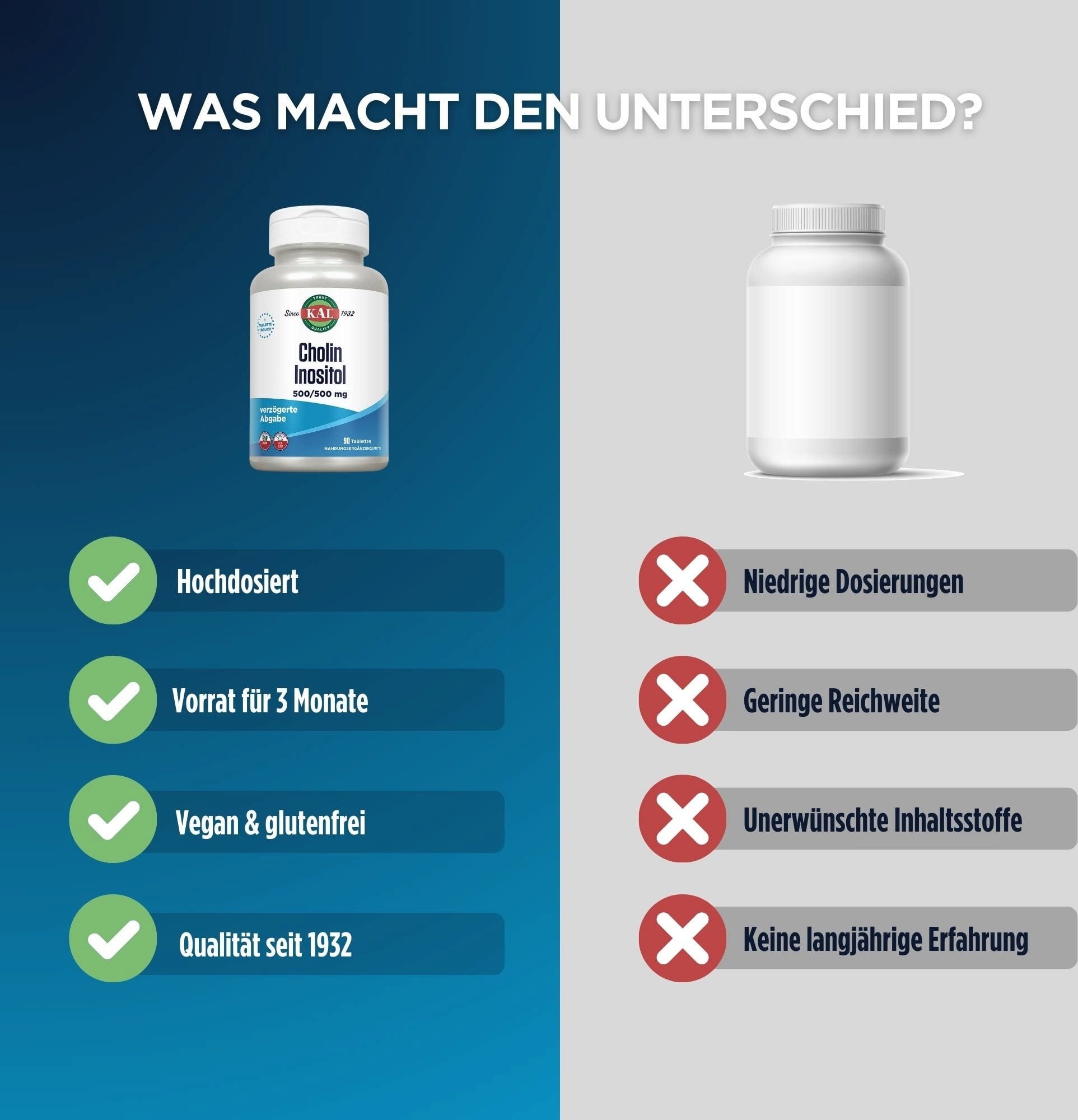 Sowohl Cholin als auch Inositol gehören zu den B-Vitaminen und sind Bausteine von Lecithin. Cholin und Inositol von KAL liefert 500 mg je B-Vitamin.