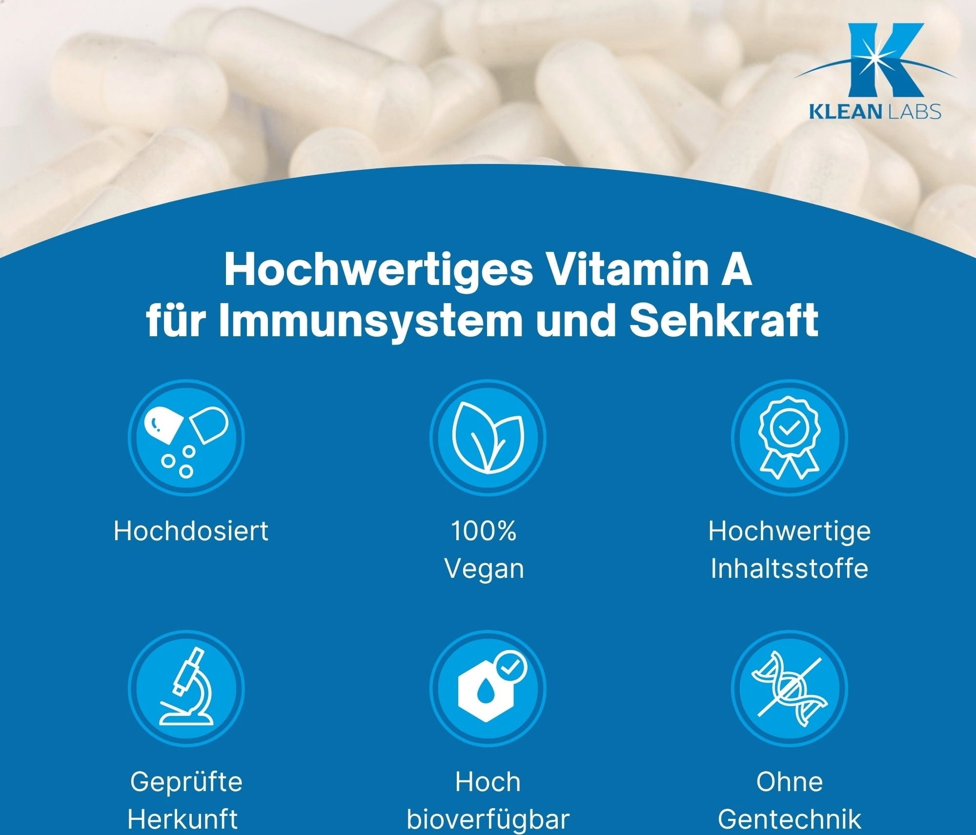 Vitamin A ist bekannt als Retinol, welches bei einigen körperinternen Prozessen eine wichtige Rolle einnimmt. Die Vitamin A Kapseln von KLEAN LABS liefern dir 1200 mcg Vitamin A pro Kapsel. Außerdem sind die Kapseln vegan und frei von Gluten sowie Gentechnik.