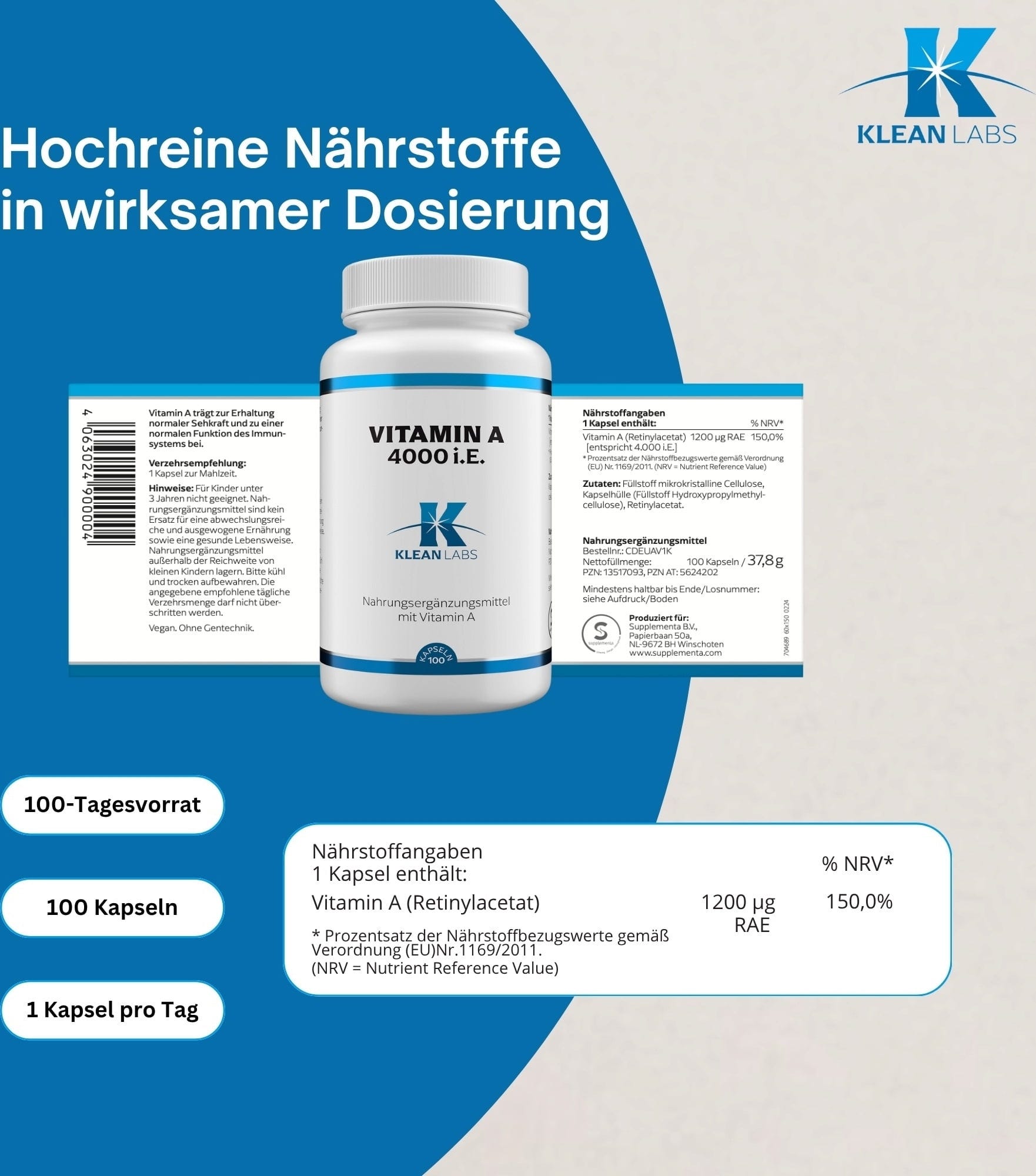 KLEAN LABS Vitamin A 4000 I.E., 100 Kapseln