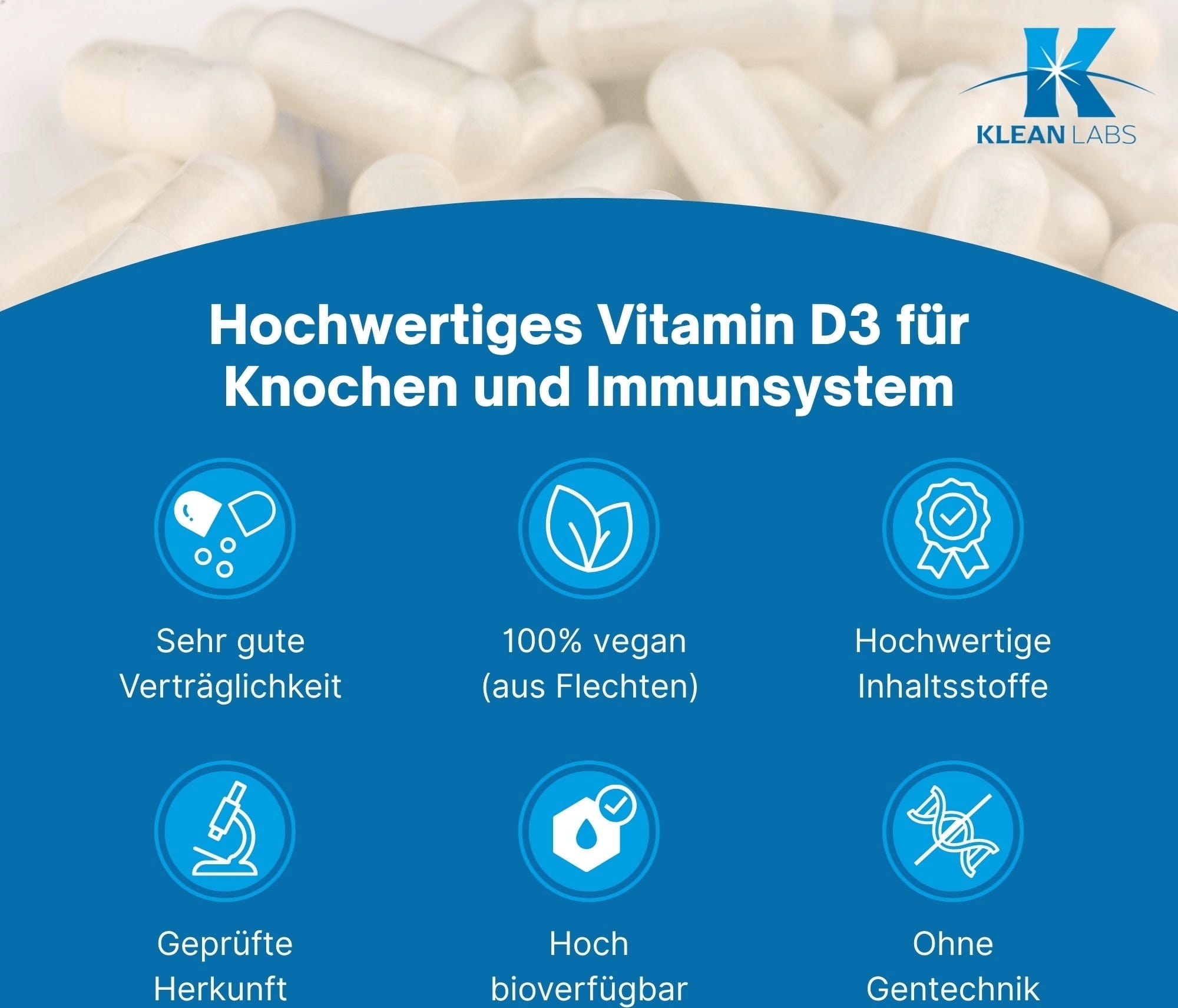 KLEAN LABS verwendet für die vegane Formulierung in Vitamin D 400 I.E Cholecalciferol aus Flechten-Extrakt. Umhüllt von einer pflanzlichen Kapselhülle, eignen sich die veganen Kapseln ideal für eine pflanzenbasierte und fleischlose Ernährungsweise.