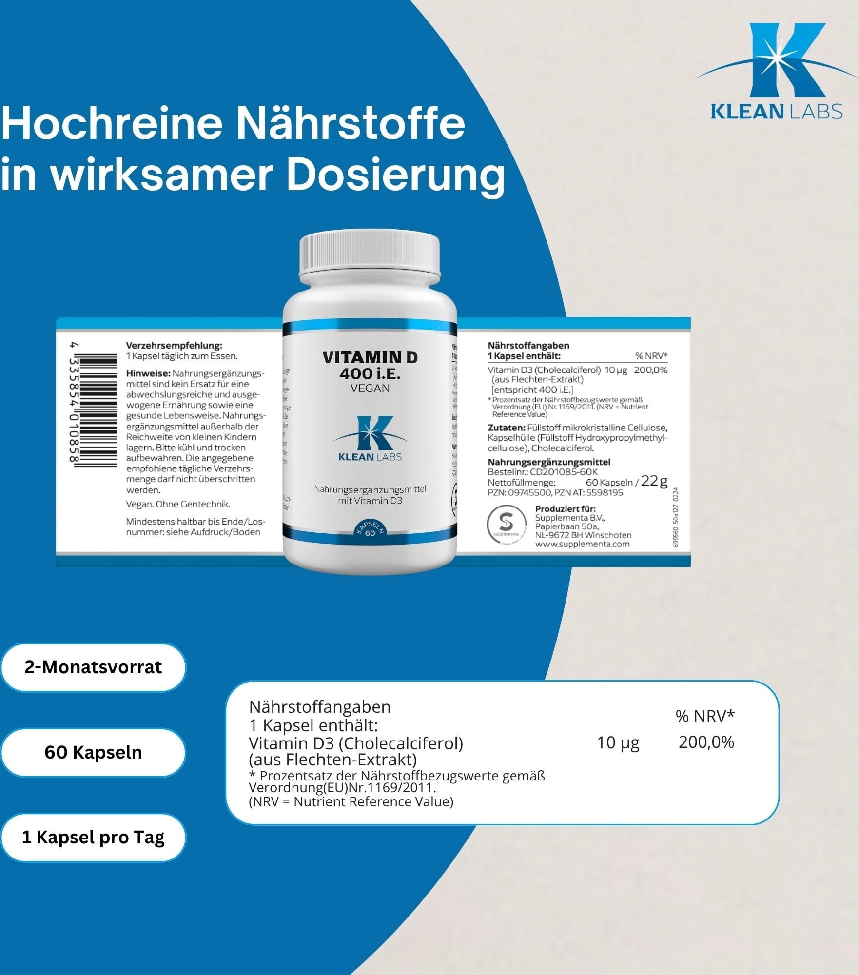 | Verantwortliches Lebensmittelunternehmen: | Supplementa Corporation B.V., Papierbaan 50a, 9672 BH, Winschoten, Niederlande, info@supplementa.com |