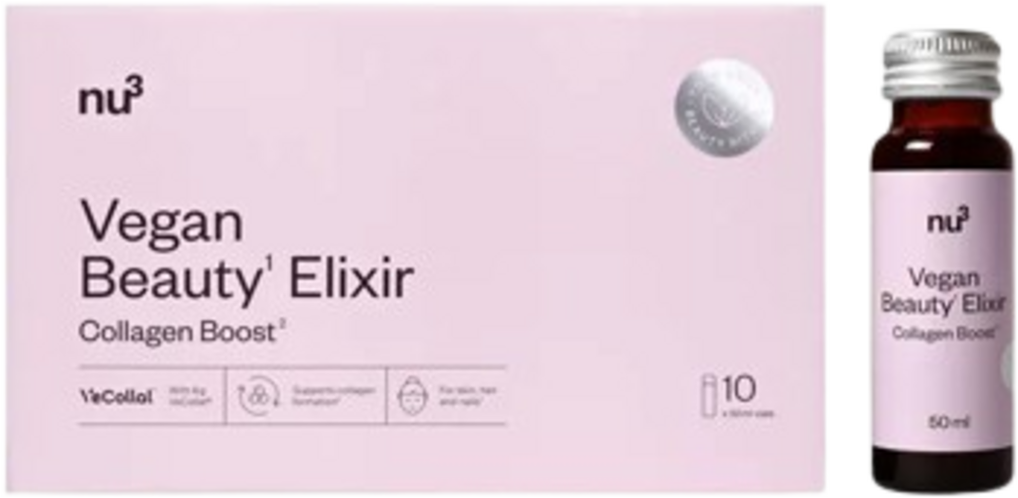 Das nu3 Vegan Beauty Elixir bietet eine pflanzliche Alternative zu traditionellem Kollagen. Die enthaltene VeCollal-Formel wurde entwickelt, um das Aminosäureprofil von Typ-I-Kollagen nachzuahmen. Zusätzlich enthält der Drink ausgewählte Vitamine und Mineralstoffe.