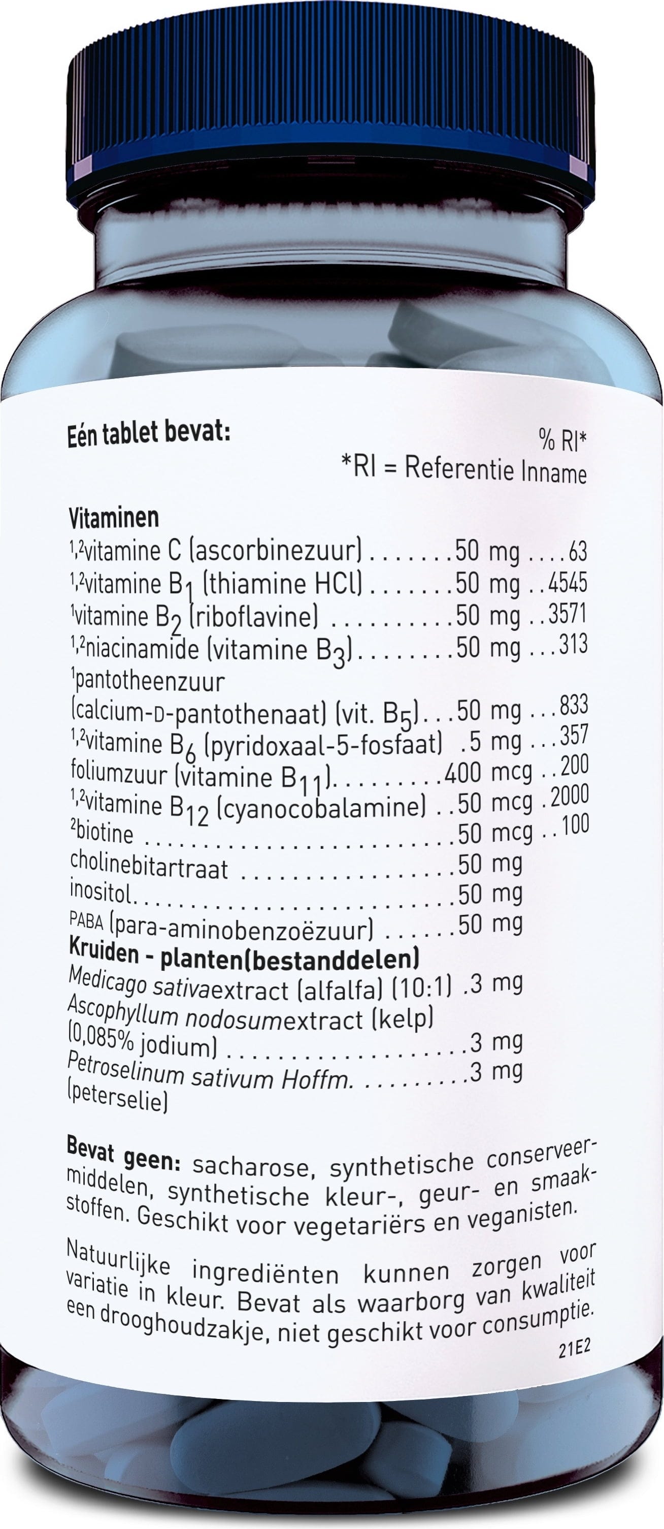 Zusätzlich zu den B-Vitaminen und Vitamin C enthält dieses Produkt Cholin, Inositol, PABA (Paraaminobenzoesäure) sowie Kelp und Petersilie. Diese Inhaltsstoffe ergänzen die Zusammensetzung des Komplexes.