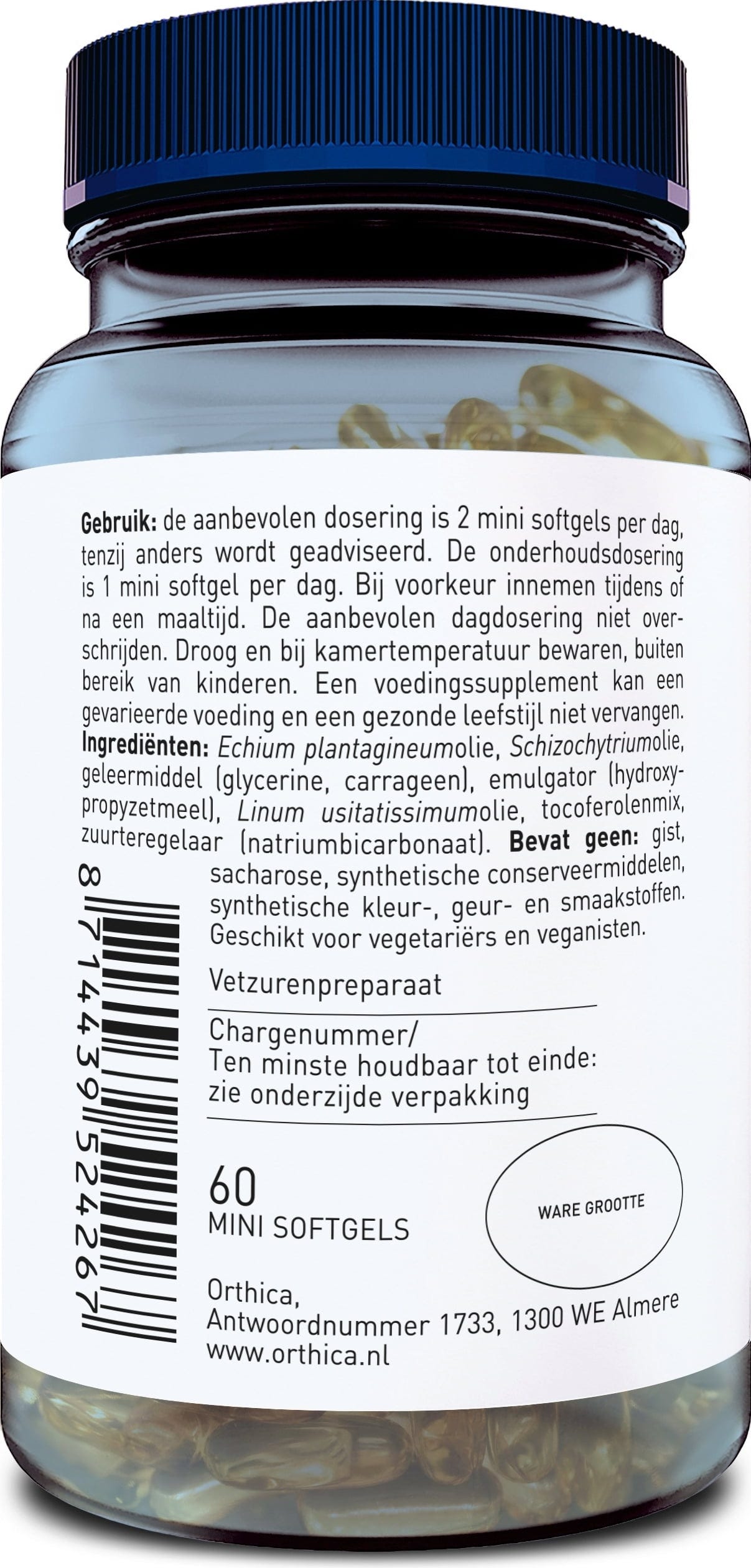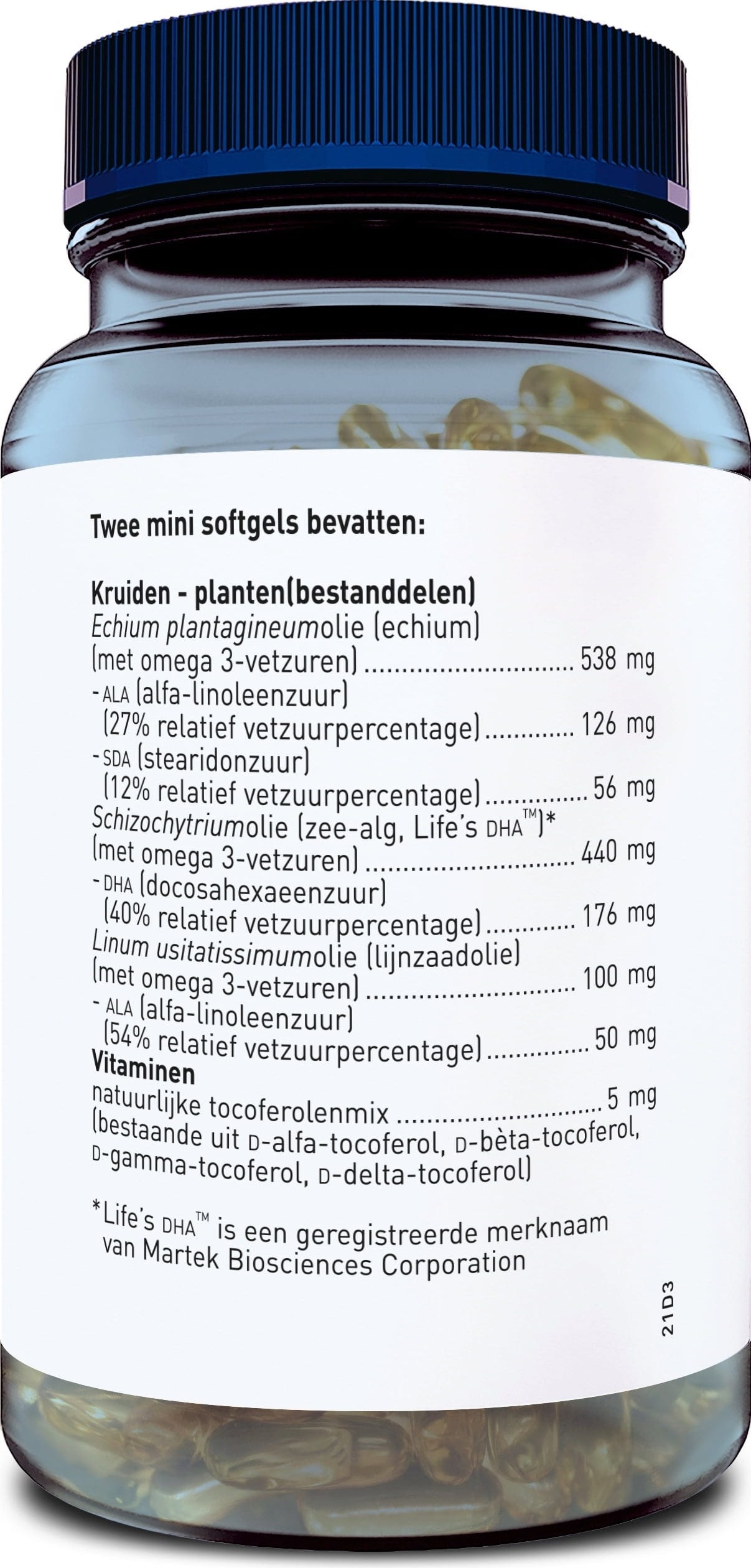 Diese veganen Omega-3-Kapseln kombinieren mehrfach ungesättigte Fettsäuren aus pflanzlichen Quellen: ALA aus Echium- und Leinöl, SDA als seltene Zwischenstufe sowie DHA aus mikrobiell gewonnenem Algenöl. Die Weichkapseln bestehen ohne Gelatine aus pflanzlichen Geliermitteln und Glycerin und sind frei von tierischen Bestandteilen – damit eignen sie sich besonders für rein pflanzliche Ernährungsweisen. Zur Stabilität der empfindlichen Fettsäuren trägt eine Mischform natürlicher Tocopherole bei.