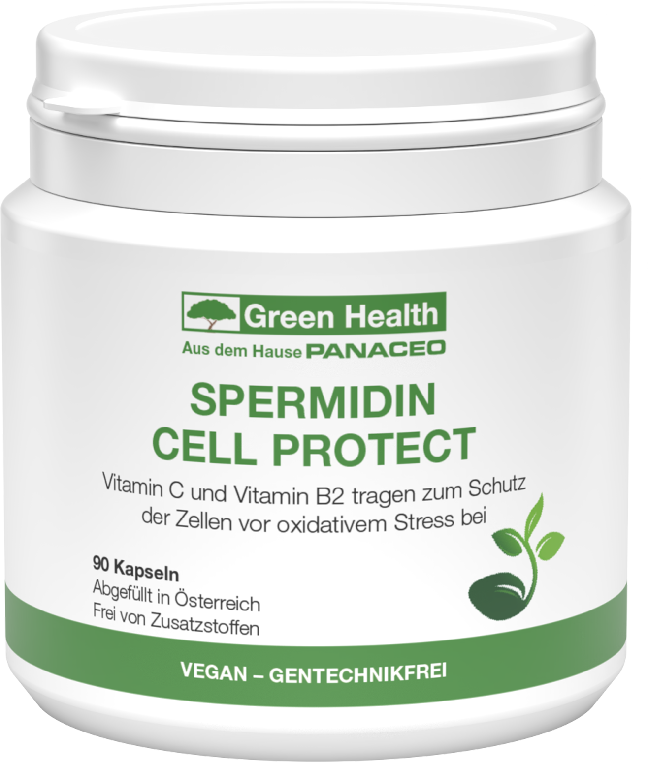 Green Health Spermidin Cell-Protect von Panaceo unterstützt ein aktives Leben bis ins hohe Alter. Die veganen Kapseln enthalten eine Kombination aus Spermidin, Vitamin C, Vitamin-B-Komplex und dem Polyphenol Resveratrol.