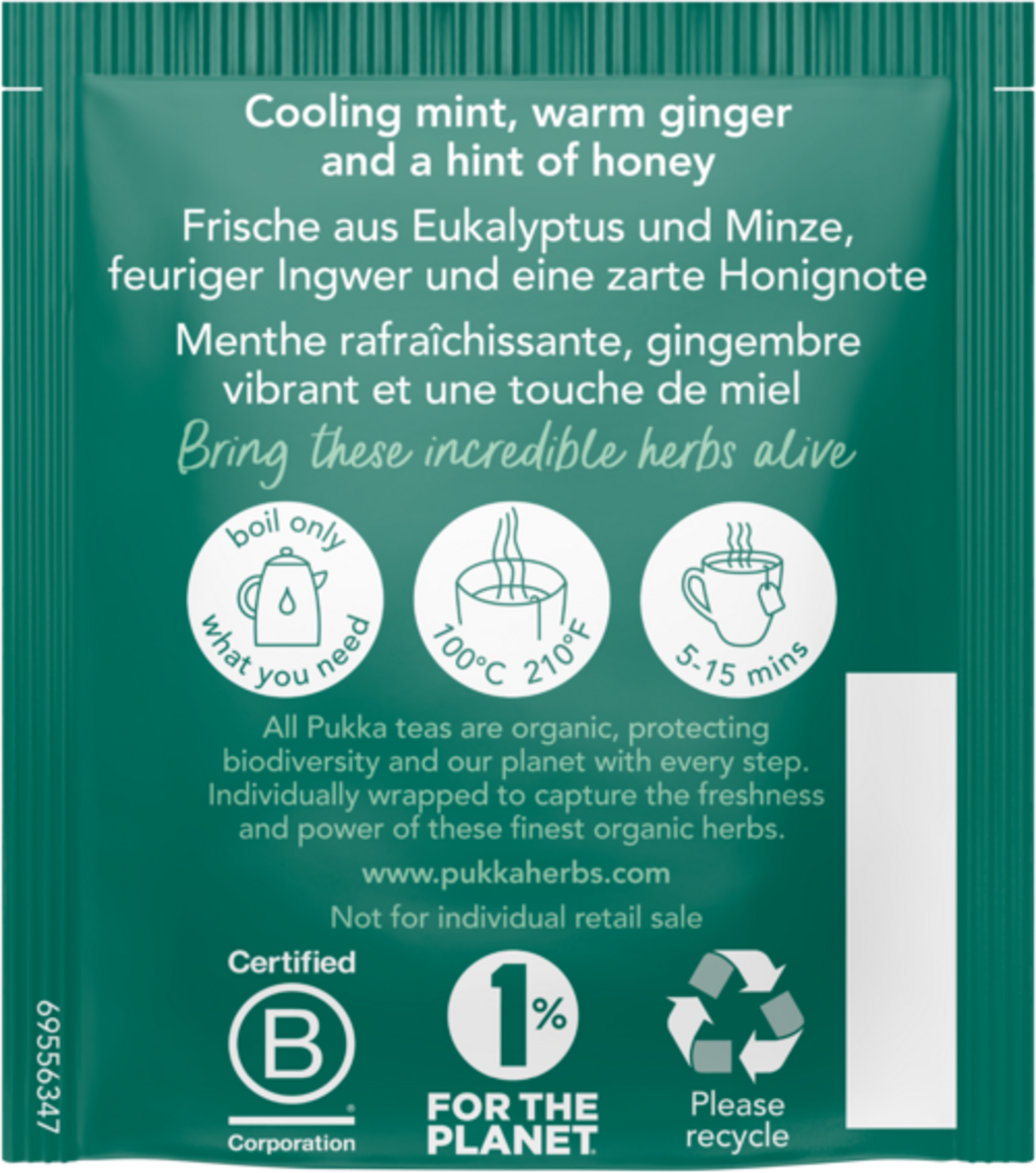 Dieser harmonisch komponierte Kräutertee bietet den perfekten Genuss, um sich einfach mal zurückzulehnen und durchzuatmen. Dabei weckt der erfrischende Geschmack die Sinne und inspiriert dich auch bei trister Wetterlage. Die kräftigen Noten aus Eukalyptus, Minze sowie feurigem Ingwer werden mit einer zarten Honignote verfeinert und sorgen für ein intensives, aromatisches Erlebnis.