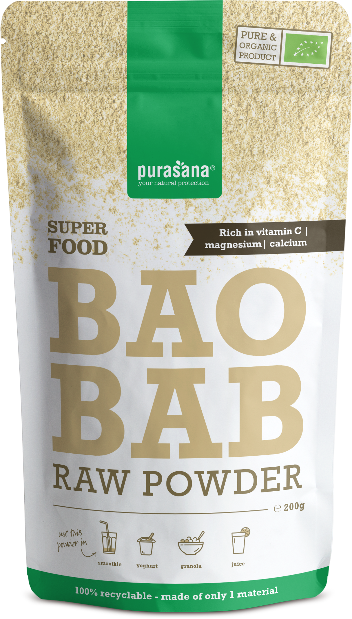 Baobab wird auch Affenbrotbaum genannt. Die harte Außenschale von der Frucht des Affenbrotbaumes wird nach der Ernte aufgebrochen und der Inhalt heraus genommen. Baobab ist bekannt für seinen hohen Vitamin C und Ballaststoff-Gehalt.