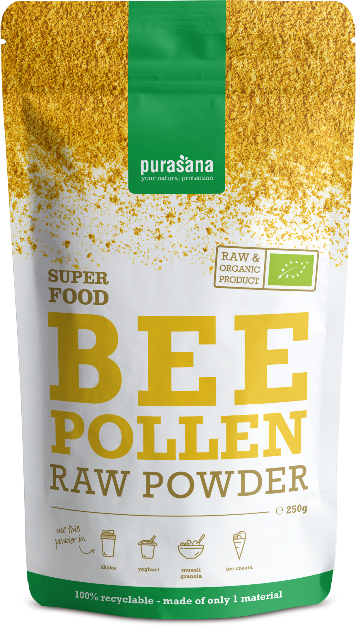 Purasana Bio Blütenpollen sind von Bienen gesammelte Blütenpollen: Die Bienen mischen die mikroskopisch kleinen Samen mit ihrem Bienennektar, sodass kleine Kugeln - die Pollen - entstehen. Höchstens 50% der Pollen werden am Eingang des Bienenstocks gesammelt. Das garantiert, dass für die Bienenpopulation noch genügend übrig bleibt. Aufgrund der Fülle an Wildblumen in den spanischen Feldern zählen Purasana-Pollen aus Spanien zu den reinsten und hochwertigsten Bienen Pollen. Bienenpollen enthalten essentielle Aminosäuren und sind reich an B-Vitaminen.