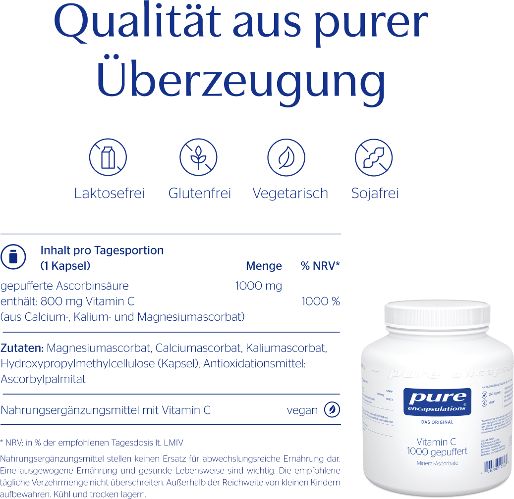 Vitamin C als Ascorbinsäure kann in manchen Fällen schlecht vertragen werden. Das gepufferte Vitamin C von Pure Encapsulations® weist beinahe einen neutralen pH-Wert auf und stellt somit keine Säurebelastung dar. Das Produkt liefert zusätzlich den Mineralstoff Calcium sowie das Spurenelement Kalium.