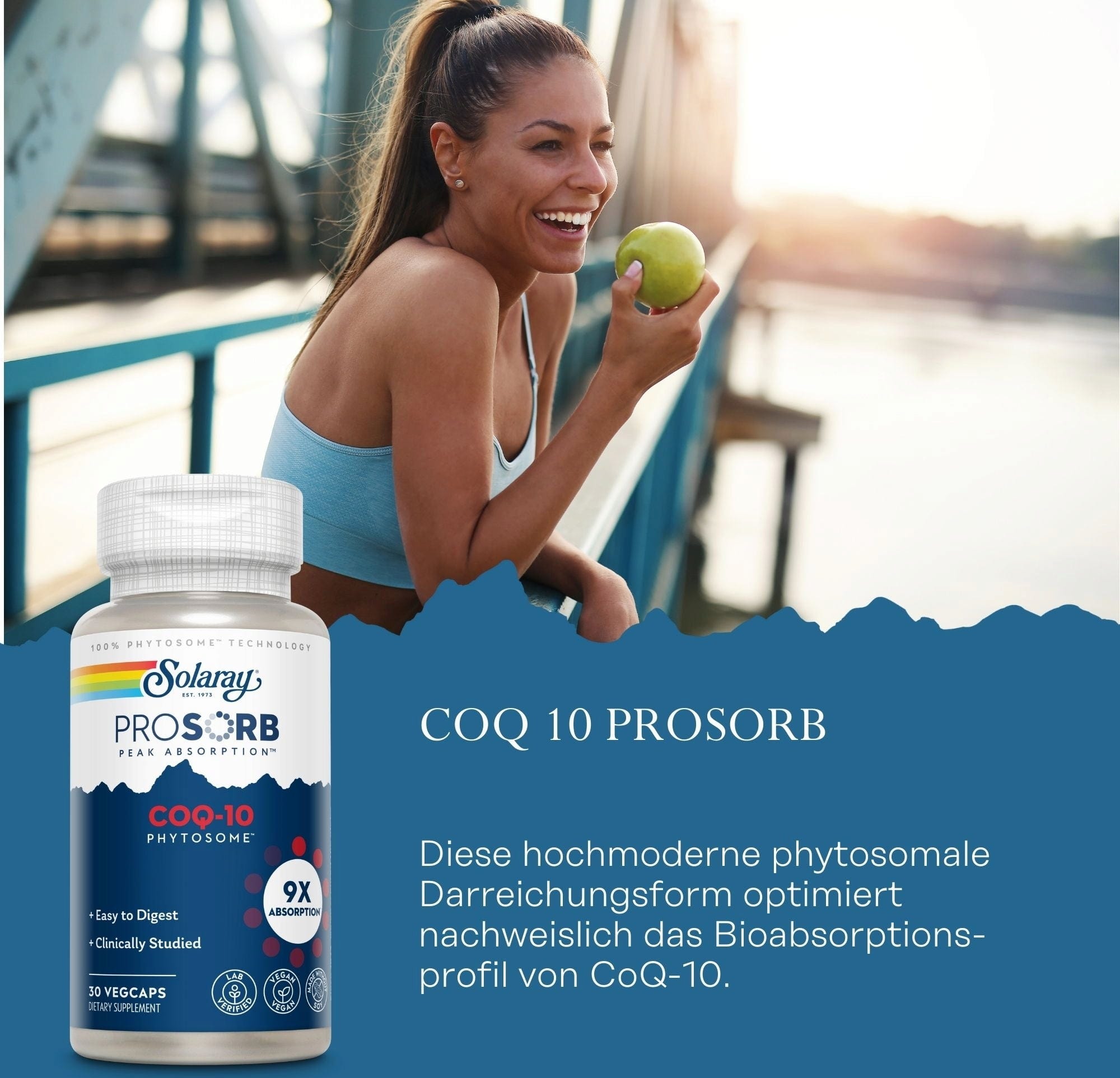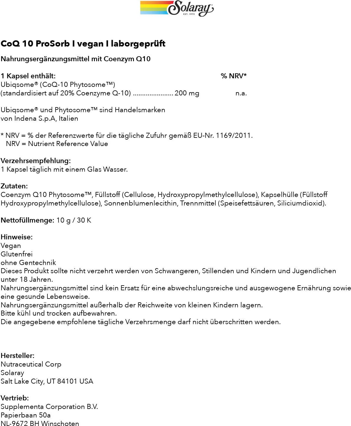CoQ-10 Pytosome™ ProSorb von Solaray sind vegane und glutenfreie Kapseln mit Coenzym Q10. Jede Kapsel enthält dabei 200 mg Ubiqsome® mit einem garantierten Gehalt von 20 % (40 mg) Coenzym Q10.