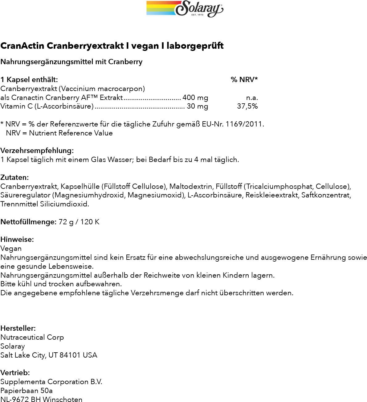 | Verantwortliches Lebensmittelunternehmen: | Supplementa Corporation B.V., Papierbaan 50a, 9672, BH Winschoten, Niederlande, info@supplementa.com |