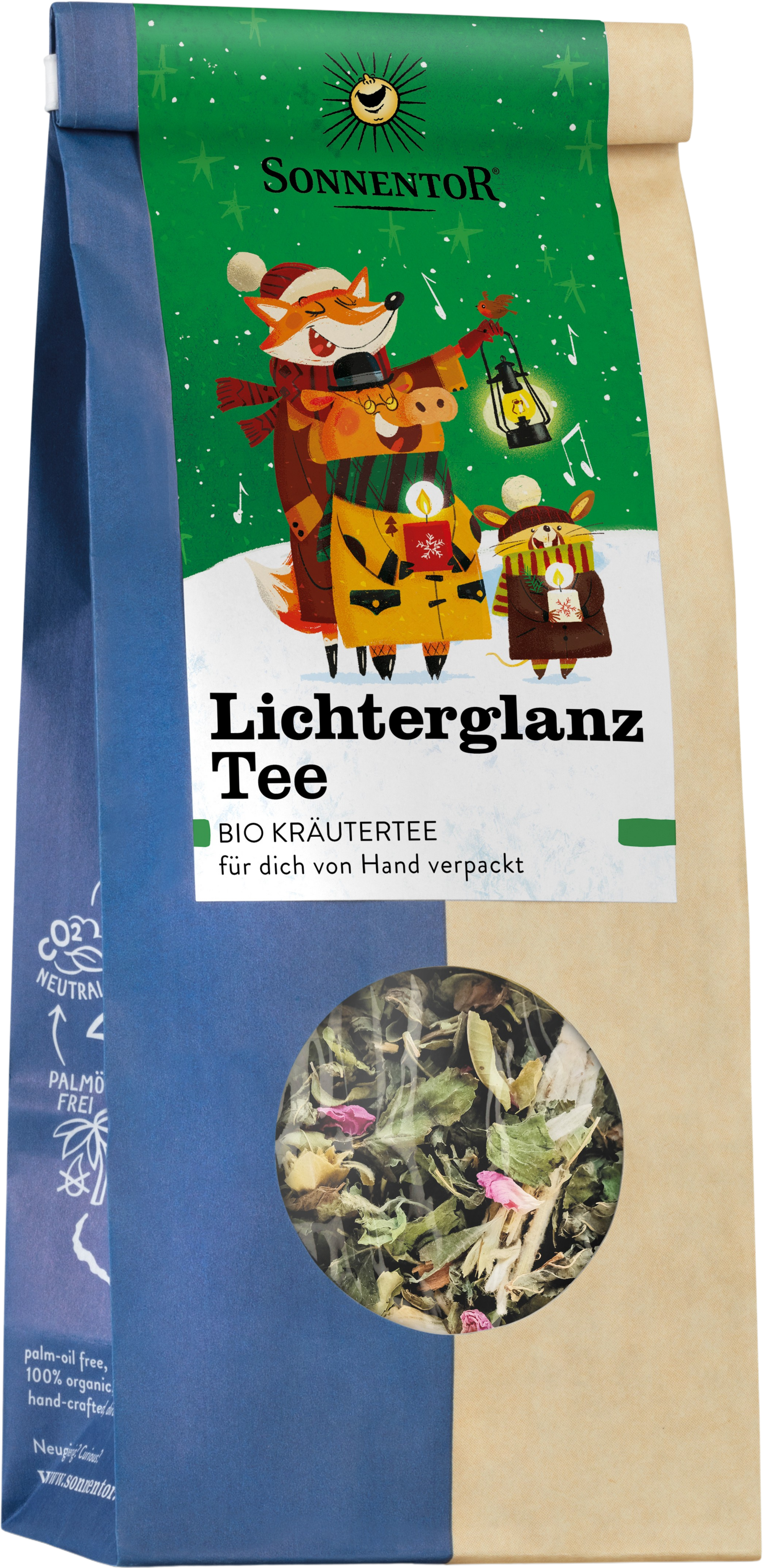 Die Teemischung "Lichterglanz" von Sonnentor lässt dich beschwingt durch Advent und Feiertage tänzeln! Sie enthält spritzige Zitronenmelisse und -verbene, samtigen Ceylon Zimt, kräftigen Sternanis, sanfte Vanille, aromatischen Bergtee aus Griechenland und zarte Rosenblüten sowie Orangenschalen für die fruchtig-milde Note.